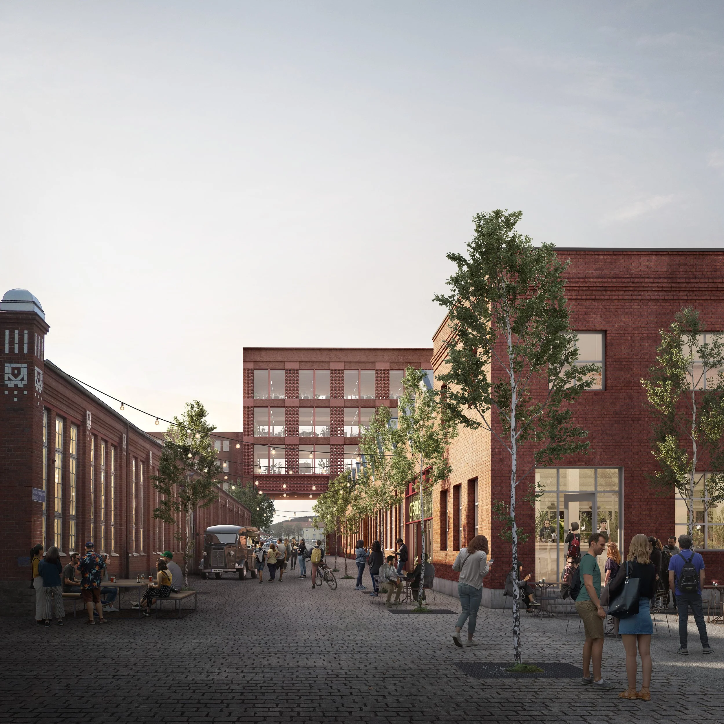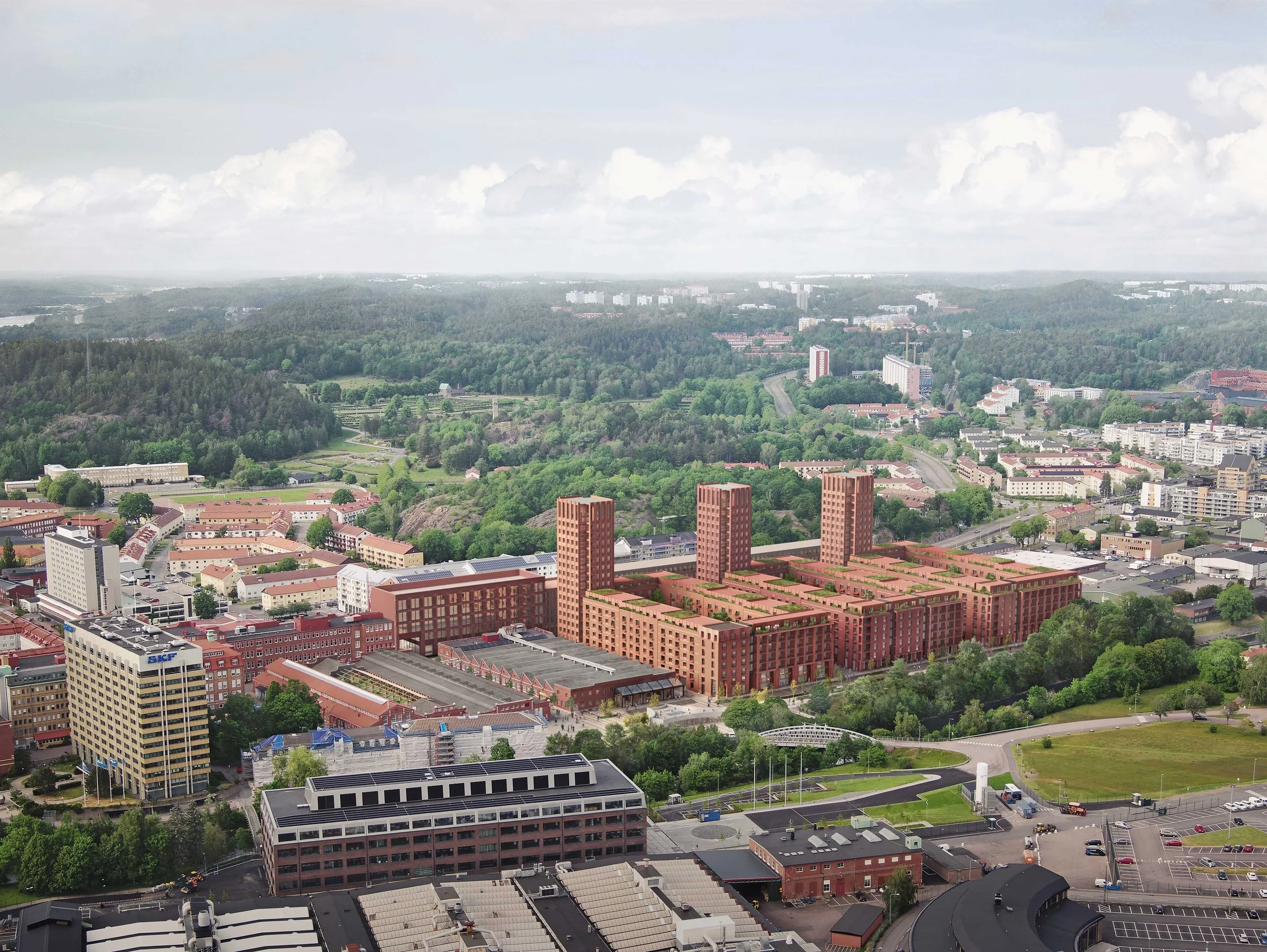 The development includes around a thousand new homes, a linear park alongside the river, and renovation of the most interesting existing buildings to provide workspace, cultural, retail and education facilities. The intention is to breathe new life into the site by revealing the history and character of the factory complex, making it an exciting new destination, and playing a pivotal role in the regeneration of northern Gothenburg.