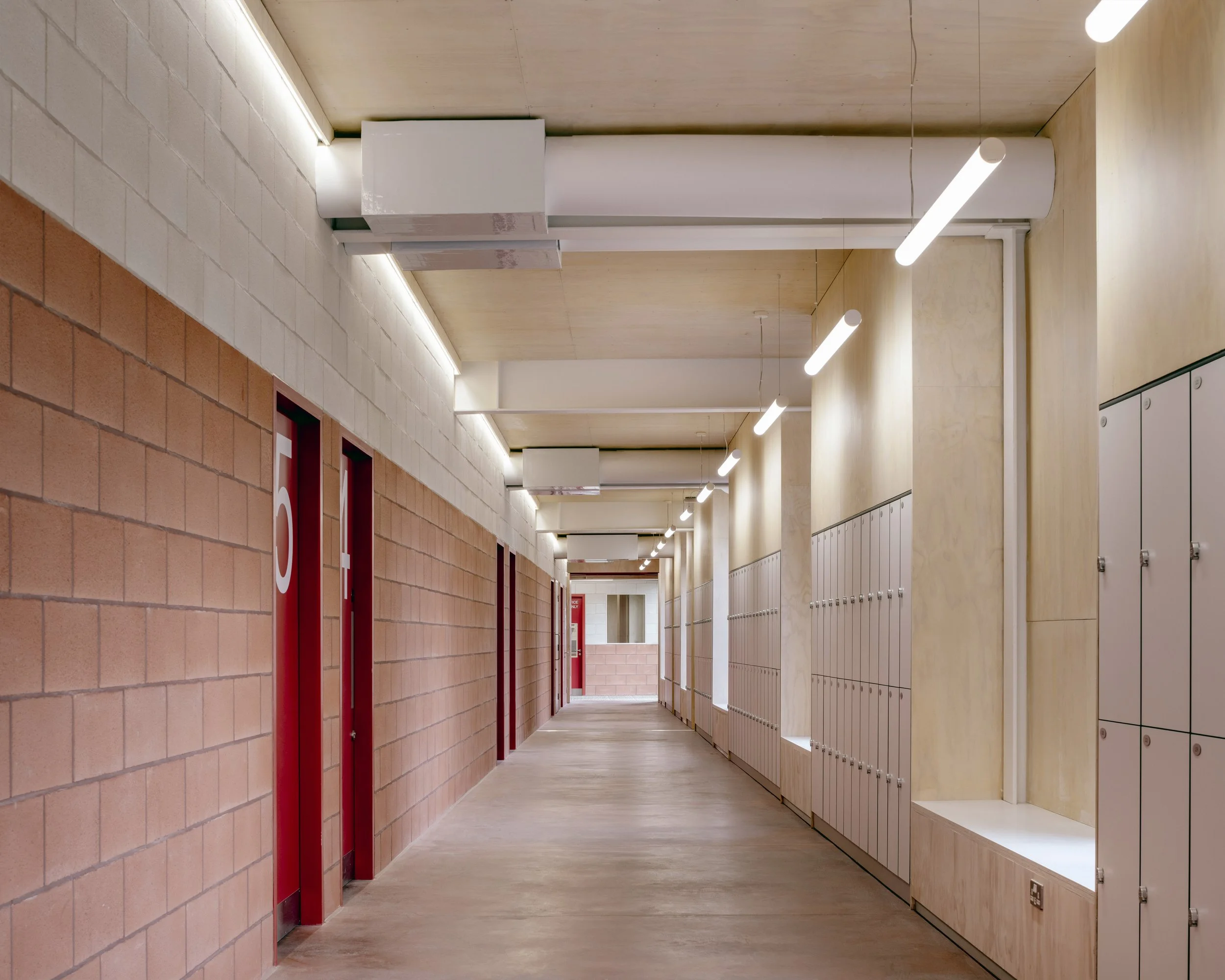 The building is all electric, with heating supplied by an air source heat pump. Plywood linings are among a series of low-carbon finishes, and materials were specified for their low maintenance and recyclability.