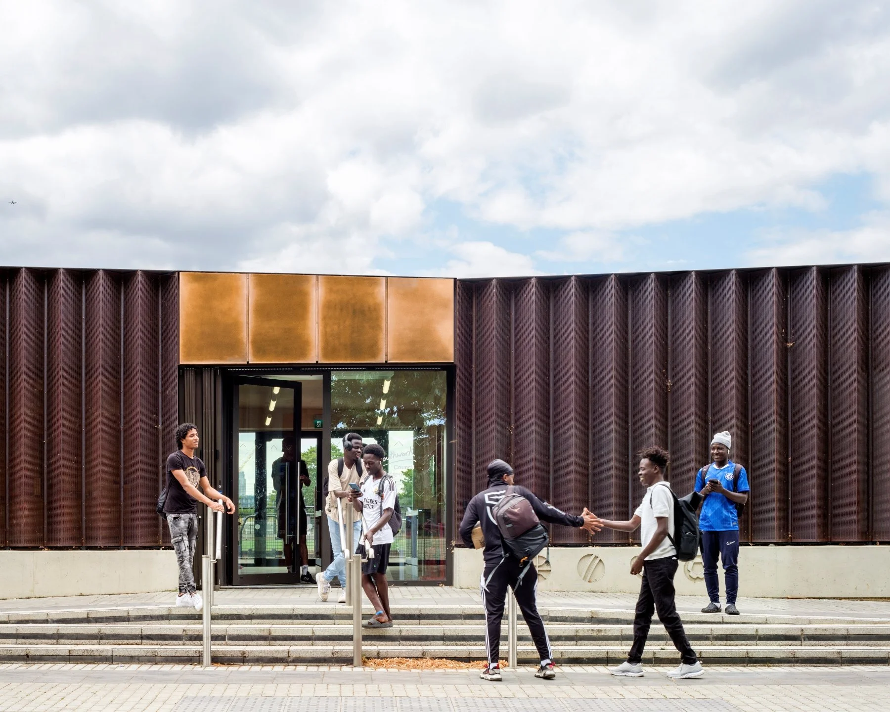 Burgess Park Sports Pavilion includes a clubroom, changing rooms, public amenities and offices for park staff. The building houses improved facilities for users of the cricket, rugby and football pitches as part of a wider plan by Southwark Council to expand accessible sports facilities across the borough.