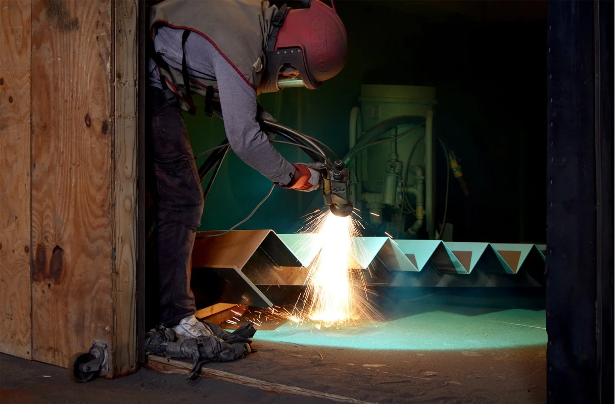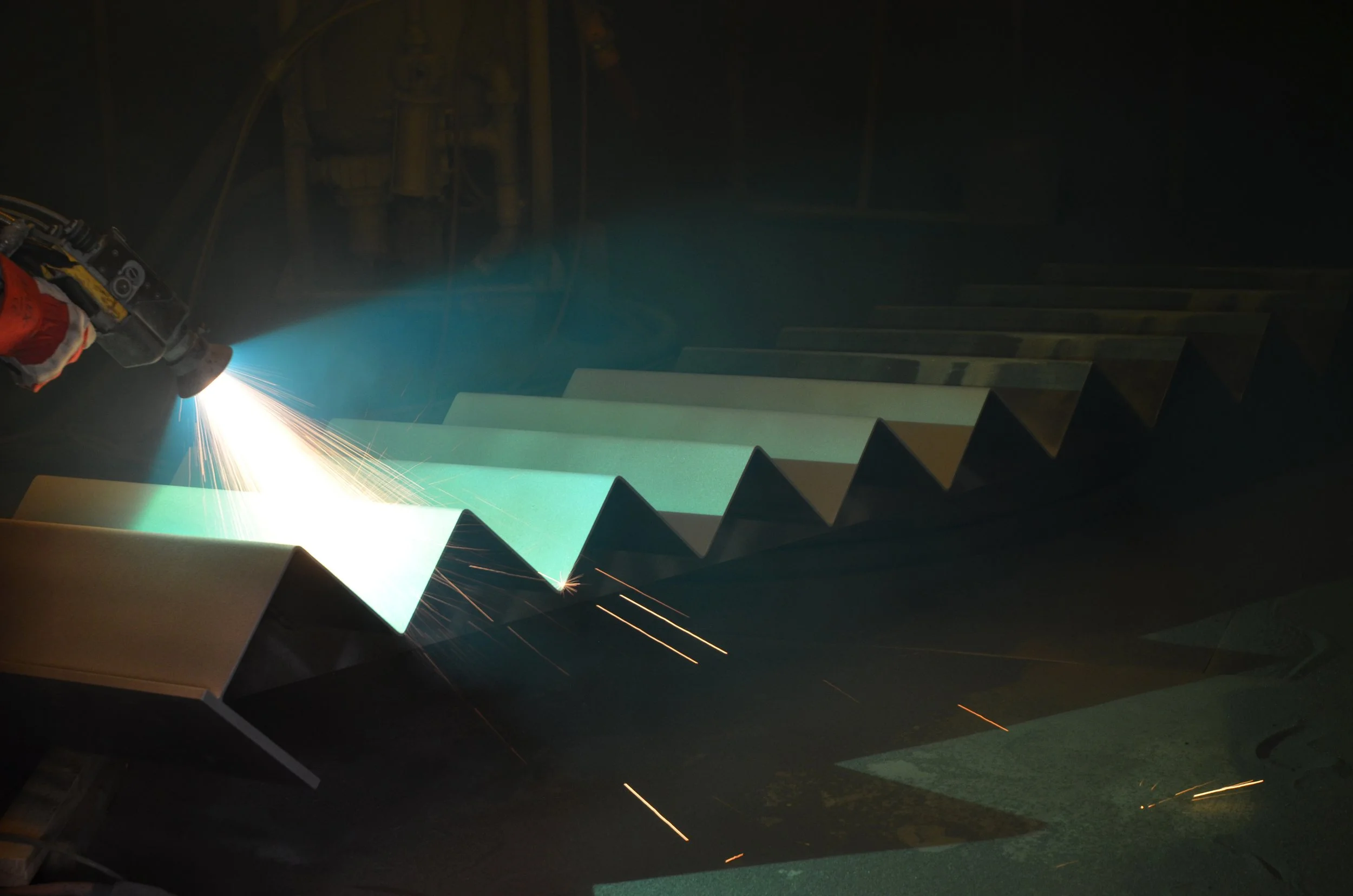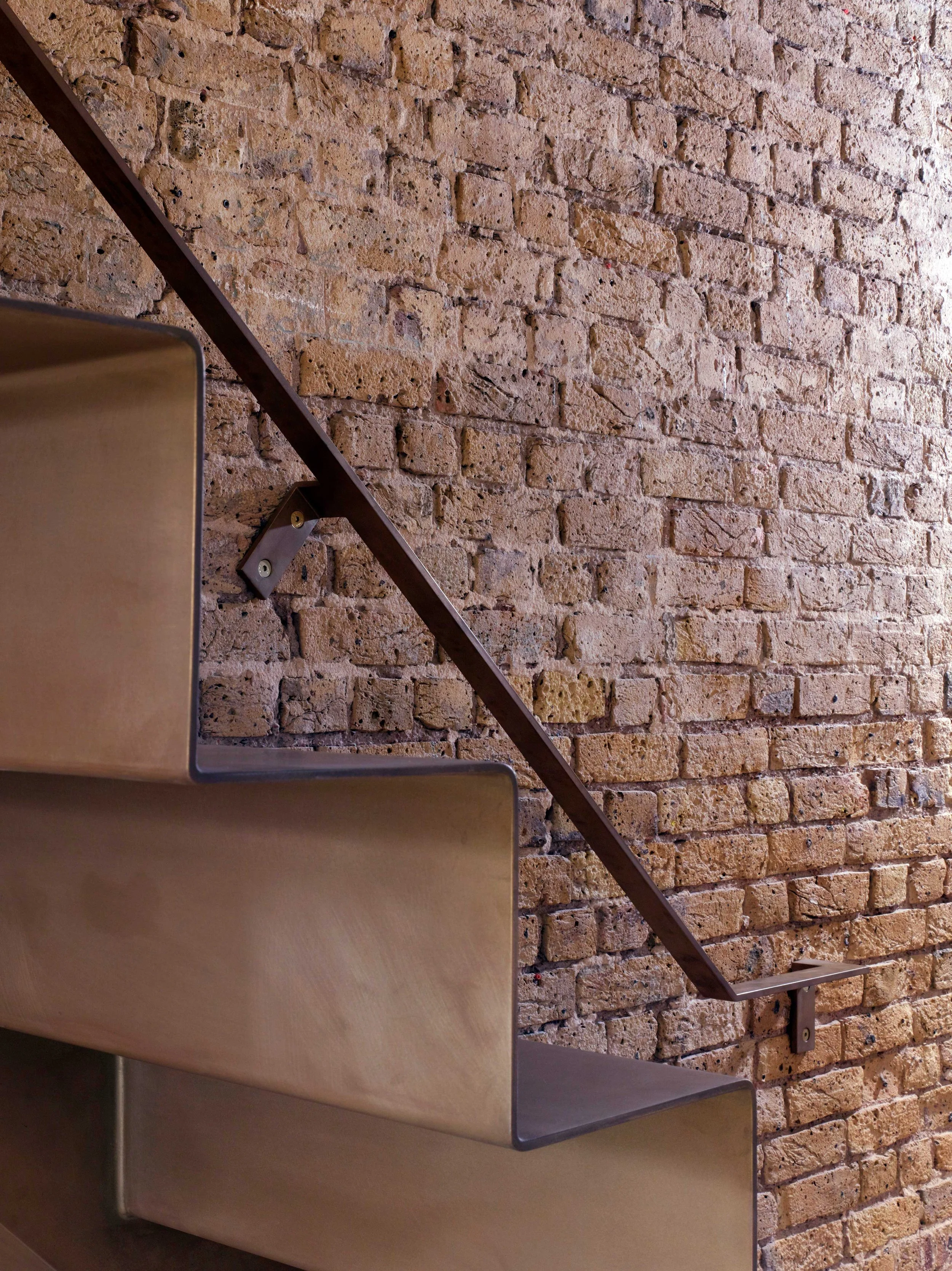 A 6mm steel sheet was folded and welded before being finished using the innovative process of spraying atomised brass directly on to the steel. The brass finish compliments with the rough existing brickwork to create a dynamic meeting of old and new.