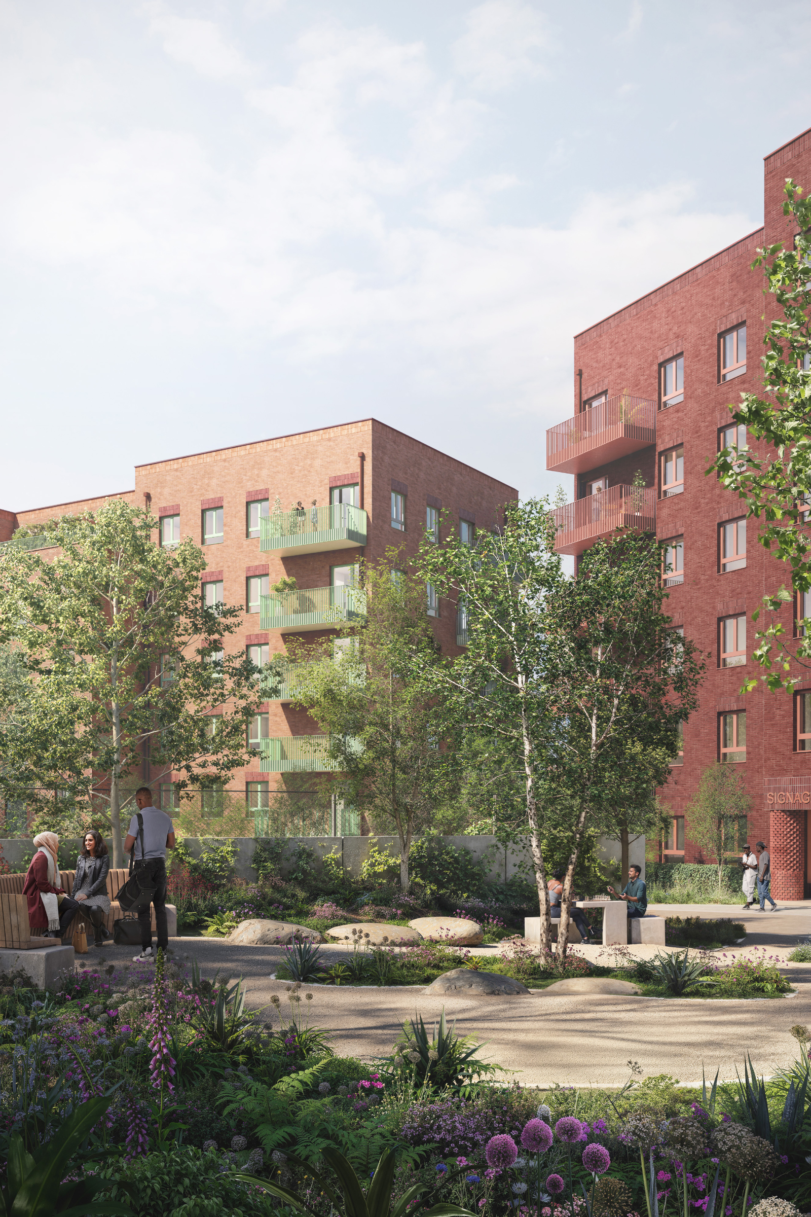 Part of the site lies within a conservation area behindgrand 19th century villas on land that historically formed their extensiveformal gardens. Inspired by this context, the design creates a journey ofgradual discovery, evoking the sense of a secret garden and opening into anunexpected retreat with buildings nestled amongst greenery. Entrances and openspaces are arranged to promote neighbourliness and a strong sense of place. Richand varied brick tones, pastel coloured detailing and metalwork echo thetextures and colours of English walled gardens.