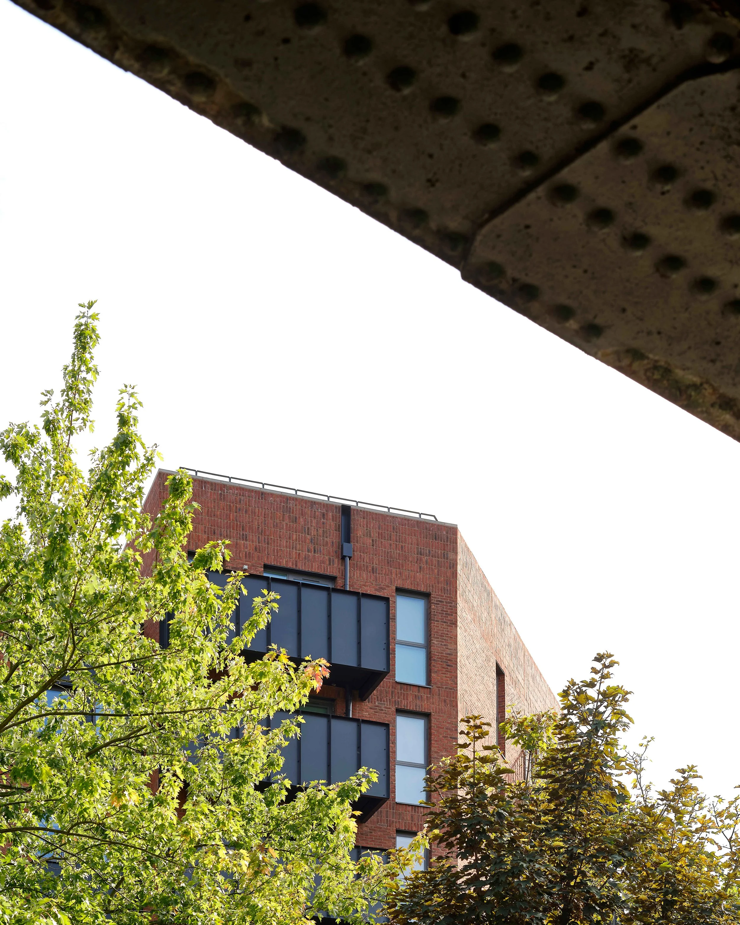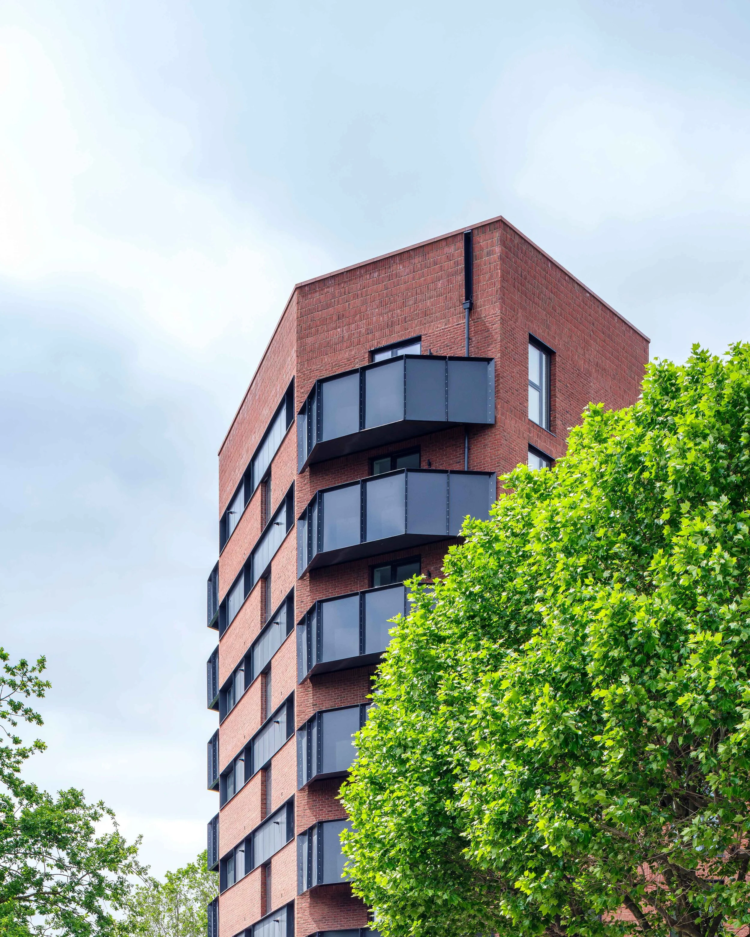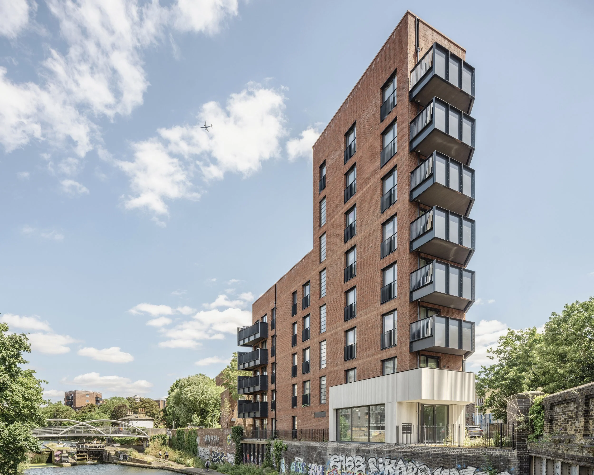Pyrus House and Chris Braithwaite House in Mile End provide 50 affordable flats for social rent overlooking the Regent’s Canal. The two buildings ‘bookend’ the Locksley Estate in facetted forms that optimise use of the complex brownfield sites. The buildings are designed as a pair with an architectural treatment that deliberately acknowledges the industrial heritage of local canal and railway structures.