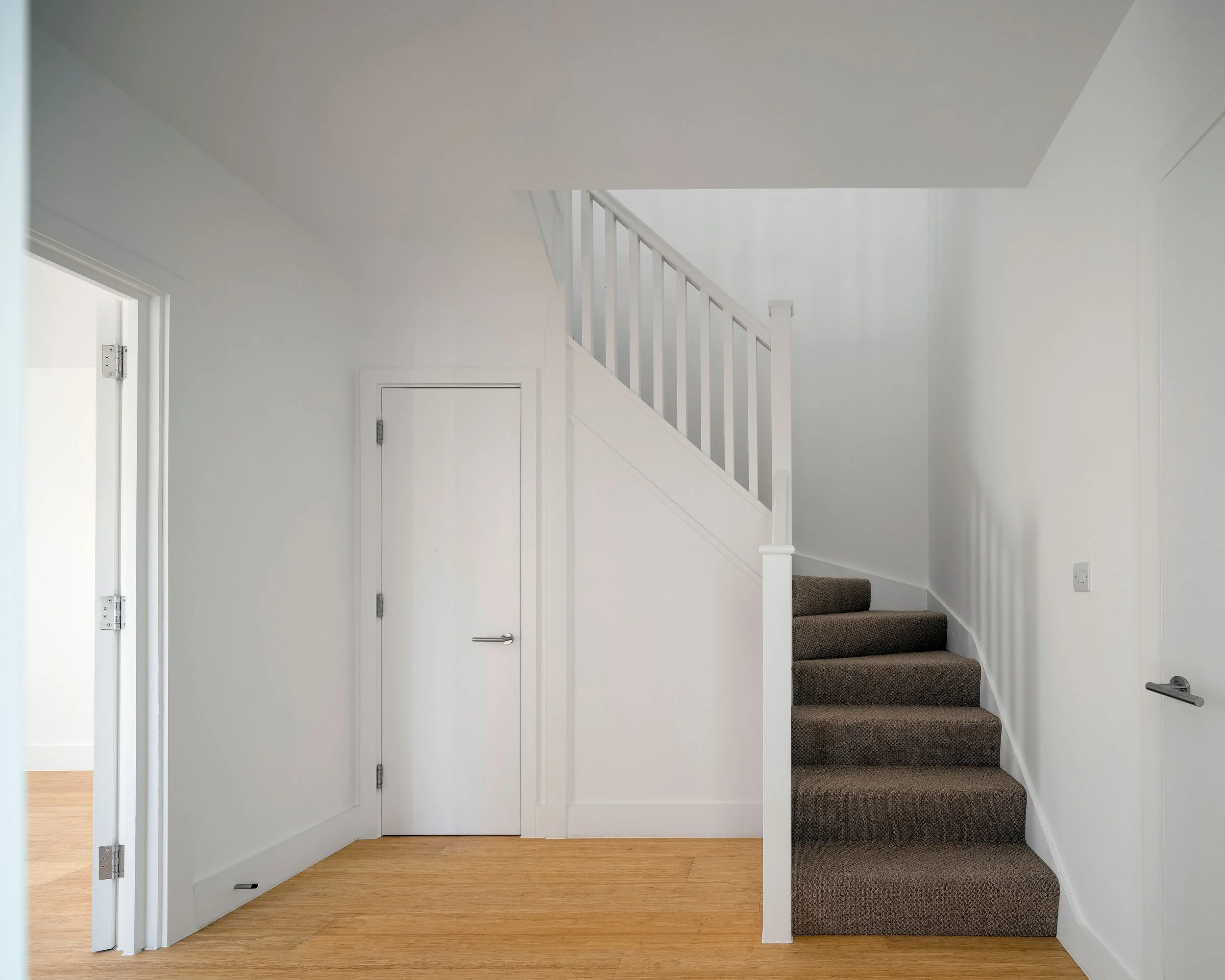 These homes provide much-needed temporary housing on an under-utilised brownfield site for Watford’s residents, helping to relieve the housing shortage. The five homes are constructed using a lightweight timber frame for its ease of construction and low embodied carbon. To future-proof the homes, the pitched roof structure and internal stair have been designed to allow the loft space to be easily converted into an additional bedroom, extending the capacity of the house without requiring any significant structural work.