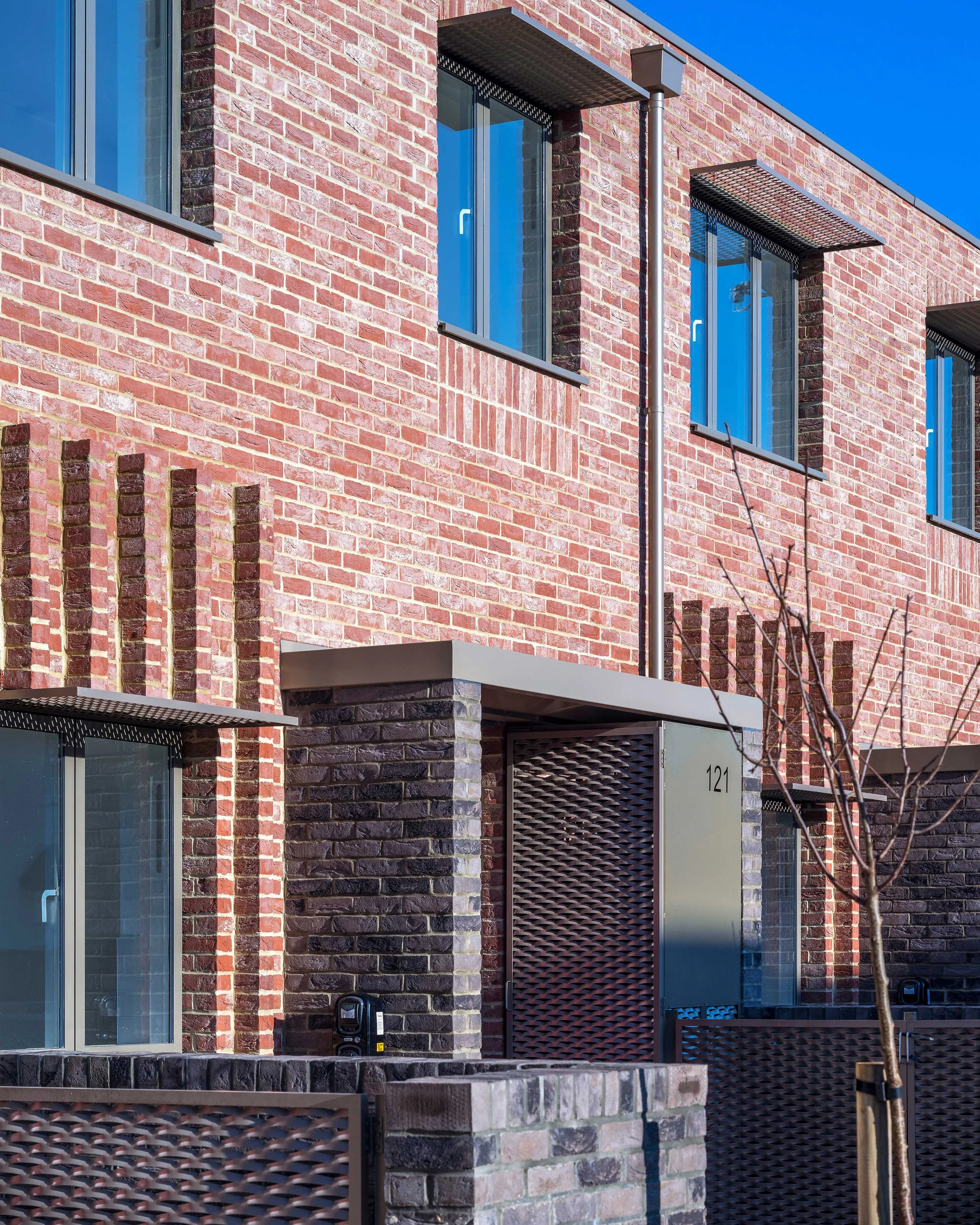 To complement the neighbouring properties, rich red brick was used for the main façade material, with dark grey brick and a stepped brickwork detail to add depth and texture. Brise-soleils are incorporated to minimise overheating from south-facing windows.