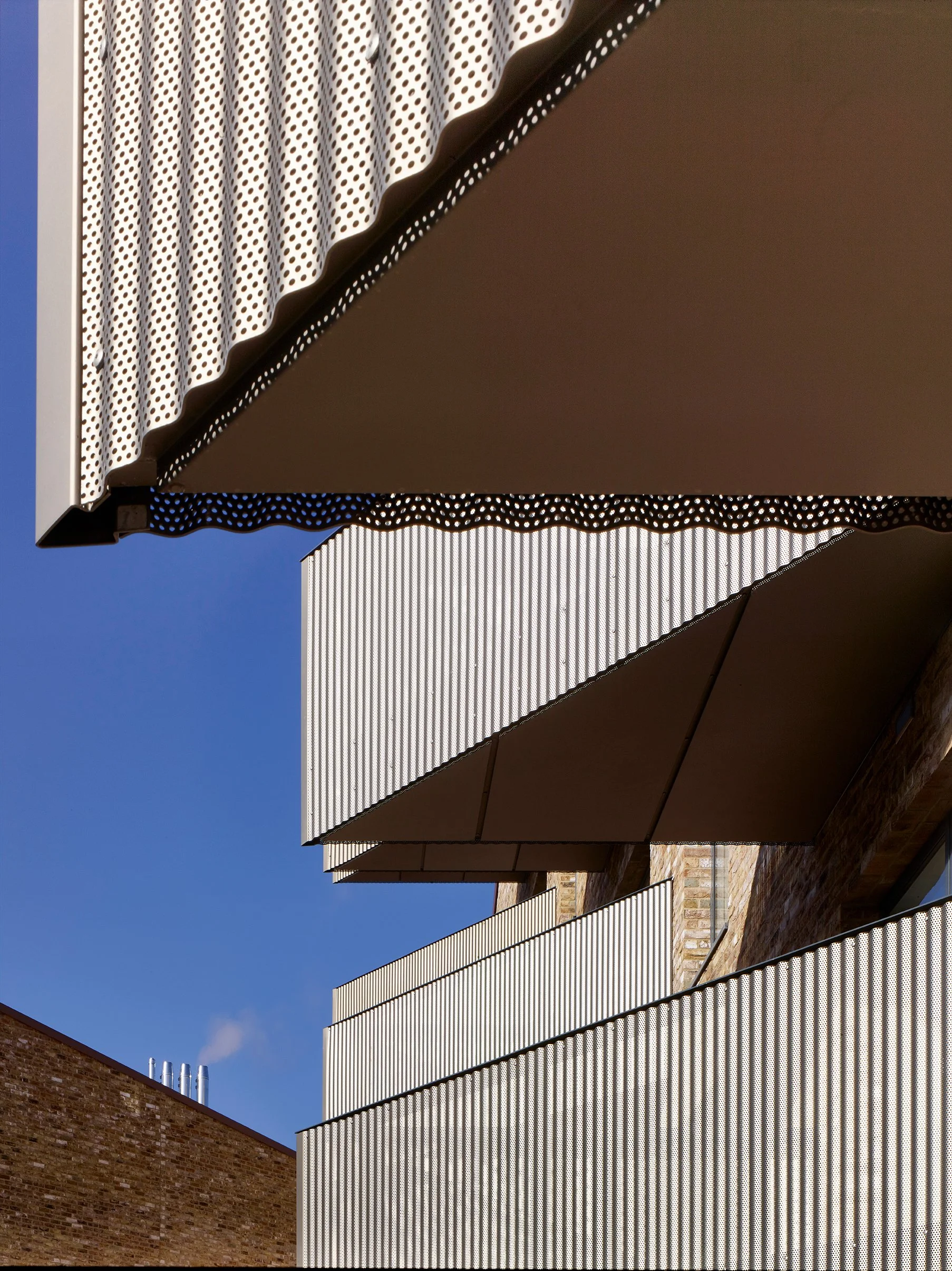 Three blocks of flats fold along the boundary of the site, creating an active, two sided street to the existing estate, whilst opening up at the centre to create a generous courtyard garden. The sculptural roof serves the dual purpose of creating a dynamic façade to the new development whilst reducing the impact of light loss to the adjacent existing properties. Generous balconies provide private external amenity to all units and views towards the River Thames.